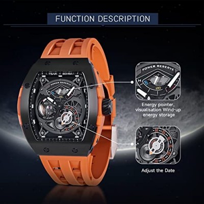TSAR BOMBA 남성용 시계 자동 기계식 무브먼트 크로노그래프 오리지널 디자인 50M 방수 토너 스테인레스 스틸 케이스와 실리콘 스트랩 남성용 독특한 패션 선물     상품설명 - 수입됨