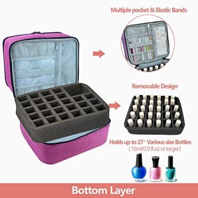 - 【좋아하는 색상을 담을 수 있는 충분한 공간】- 네일 정리함과 보관함에는 네일 아트 브러시, 큐티클 커터, 매니큐어 리무버, 스티커, 가위 및 기타 작은 네일 액세서리를 보관할 수 있는 여러 개의 포켓과 탄성 밴드가 있습니다. 큰 하단 수납공간(3가지 사이즈) 병 분배기)에는 15ml(0.5fl.oz) 매니큐어 병을 최대 27개 담을 수 있습니다.
