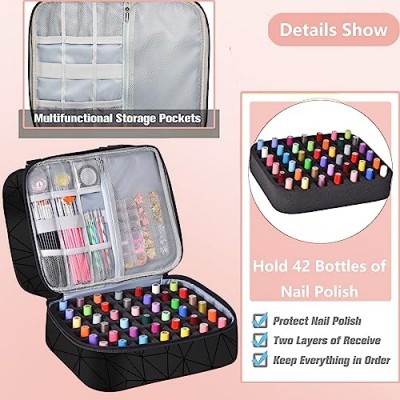 - 2. 『더블 레이어 디자인 분리형 스펀지』- 네일 가방에는 42개 이상의 매니큐어 병, 네일 파일, 네일 브러시 및 기타 네일 도구를 담을 수 있습니다. UV LED 네일 램프, 모든 광택제, 가위, 소형 보관에 적합합니다. 매니큐어 리무버 등 병. (가방만 해당) 바닥에 유연하고 탈착 가능한 스펀지 칸막이가 있는 큰 수납공간이 있어 여러 개의 매니큐어를 안전하게 담을 수 있습니다.