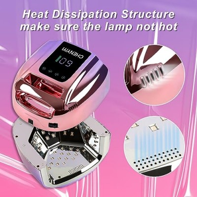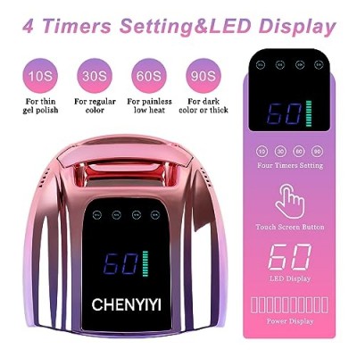 CHENYIYI 96W 충전식 UV LED 네일 램프, LCD 디스플레이 자동 센서가 장착된 손톱용 휴대용 무선 자외선, 살롱용 젤 폴리쉬 광 경화 램프용 전문 네일 건조기(보라색)상품설명 - 【고출력 및 빠른 건조】빠른 건조를 위한 96W 고출력, 최대 12시간 지속되는 42개 LED 비드는 젤 매니큐어를 균일하고 효율적으로 경화하는 데 도움이 됩니다. 이 무선 네일 램프에는 충전식 리튬 배터리 15600mAH 배터리가 내장되어 있으며 2시간 완전 충전 후에도 12시간 동안 계속 작동합니다.