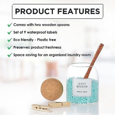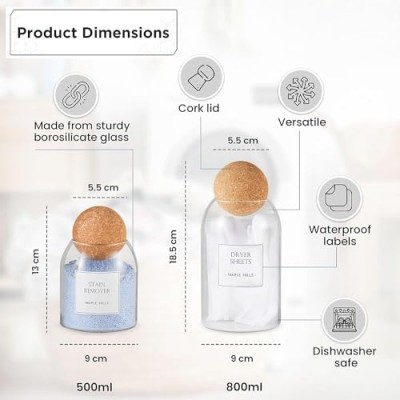- MAPLEHILLS 투명 용기(뚜껑 포함) 포함 - 용기에는 코르크 뚜껑이 있는 두 가지 크기(17oz/500ml 및 27oz/800ml)의 볼 보관 용기 2개가 포함되어 있습니다. 또한 세탁실, 다용도실, 식료품 저장실 공간을 정리하려는 사람들을 위한 나무 숟가락 2개와 세탁 방수 라벨 9개 컬렉션도 포함되어 있습니다.