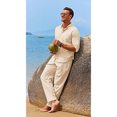 COOFANDY 남성용 2피스 리넨 세트 캐주얼 버튼 다운 셔츠 바지 캐주얼 비치 여름 요가 의상상품설명 - 부드럽고 가벼운 원단