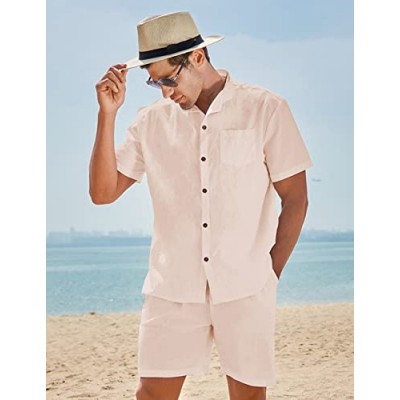DUOFIER 남성용 리넨 복장 반소매 셔츠 및 사이드 포켓이 있는 조임끈 허리 바지 요약정보 및 구매