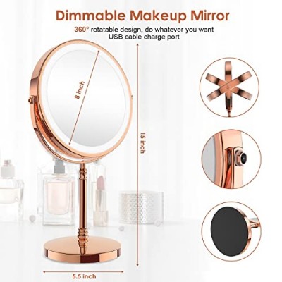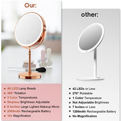 조명 화장 거울, 8인치 충전식 양면 확대 거울, 3가지 색상, 1x/10x 360° 회전 터치 스크린 화장 거울, 밝기 조절 가능한 배율 화장품 조명 거울     상품설명 - 【10X 확대 양면 고화질】 1X/10X 확대, 클래식 양면 디자인으로 이 LED 메이크업 거울을 훨씬 더 쉽게 만들어 완벽한 메이크업 룩을 연출할 수 있습니다. 메이크업뿐만 아니라 콘택트렌즈 착용, 눈썹 다듬기, 면도, 헤어 스타일링, 페이셜 트리트먼트, 마스카라 바르기 등 얼굴 디테일에도 양면 효과가 있습니다. 따뜻한 팁: 10배 확대경을 사용할 때는 현기증을 피하기 위해 거울에서 얼굴을 6인치 떨어진 곳에 두십시오.