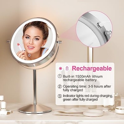 LOVESPEJO 조명 돋보기, 8" 3가지 색상의 충전식 양면 조명 화장 거울, 1x/7x 360°회전 터치스크린 화장 거울, 밝기 조절 가능 Led 화장대 거울, 크롬상품설명 - 【7X 배율 및 72개의 LED 램프 비드】 72개 LED 램프 비드는 안정적인 초고휘도 광원, 최대 밝기 1080Lux 및 연색성 지수(CRI) 85±10을 제공합니다. 7배율로 얼굴의 세부 묘사까지 선명하게 초점을 맞춥니다. 콘택트렌즈 착용 / 눈썹 정리 / 머리 스타일 / 면도 / 페이셜 케어 또는 마스카라 바르기. 따뜻한 팁: 7배 확대 거울을 사용할 때는 현기증을 피하기 위해 거울에서 얼굴을 4인치 떨어진 곳에 두십시오.