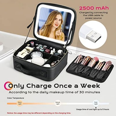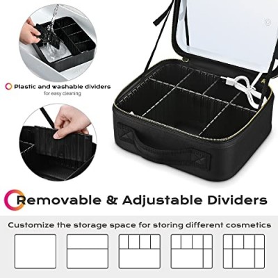 BYOOTIQUE 메이크업 가방 여행용 메이크업 케이스(LED 조명 거울 포함) 화장품 주최자 조절 가능한 칸막이가 있는 보관 브러시 홀더 화장품용 휴대용 아티스트 보관 가방 세면도구 보석 선물, 블랙상품설명 - [LED 조명 거울]: 10" x 9" x 4" Byootique 메이크업 케이스는 시원하고 자연스럽고 따뜻한 빛을 포함한 3가지 색온도의 LED 조명 거울을 갖추고 있어 정밀한 데일리 및 카메라용 메이크업을 만들기 위해 얼굴을 비춥니다. 편리한 충전식 배터리로, USB 케이블을 전원에 연결하여 완충 후 5시간 연속 점등이 가능합니다.