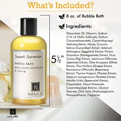 Nabila K - Sweet Surrender - 거품 목욕 - 천연 성분 - 에센셜 오일 - 민감성 피부 - 눈물이 나지 않음 - 순한 포뮬러 - 보습 - 럭셔리 거품 목욕 - 여성 및 남성 - 꿀 및 아몬드 - 8온스상품설명 - 달콤한 항복: 마음을 달래주는 꿀과 아몬드가 달콤한 항복의 천국 같은 경험을 선사합니다. 석류와 무화과의 과일향이 함유되어 있습니다. 우리의 거품 목욕은 자연 유래 성분과 최고급 에센셜 오일을 함유하여 자연의 가장 인상적인 향을 모방합니다.