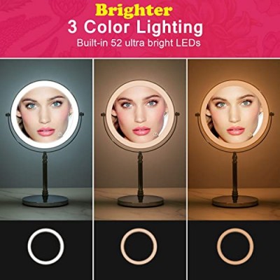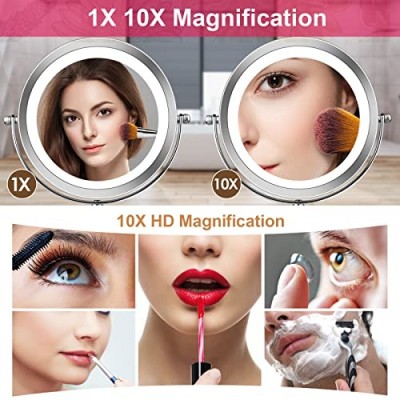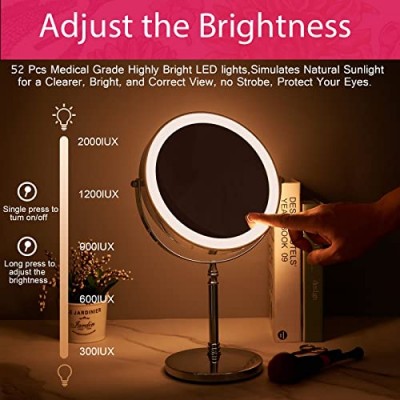 Quinskkin 조명 화장 거울, 조명이 있는 8인치 10X 확대 화장 거울 3색 LED 메이크업 개인 거울 밝기 조절 가능, 360°회전식 화장대 화장 거울     상품설명 - 【업그레이드된 디자인 조명 화장 거울】Quinskkin 8인치 조명 화장 거울에는 52개의 업그레이드된 LED가 있습니다. 양면 LED 화장 거울의 앞면은 더 높은 연색성(CRI>95)을 가지고 있으며 더 밝아지고(최대 2000럭스), 3가지 색상 조절 가능, 사용 시간이 더 내구성이 있습니다.