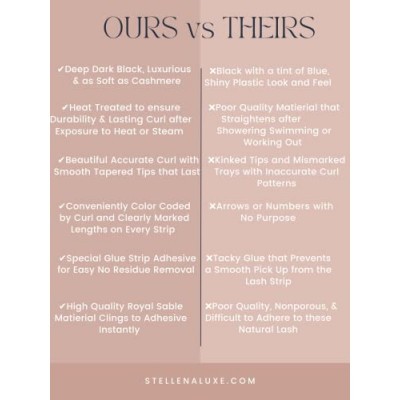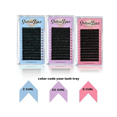 - 메가 볼륨 속눈썹 연장: Stellana Luxe 0.03 직경 속눈썹 연장은 매혹적인 모습을 연출하는 완벽한 컬과 함께 메가 볼륨 효과를 제공하는 독특한 구조를 특징으로 합니다! 우리의 트레이는 래쉬 트레이를 설정할 때 기능과 편의성을 추가하기 위해 색상으로 구분되어 있습니다. 각 개별 속눈썹 스트립에 편리하게 라벨이 붙어 있어 컬과 길이를 쉽게 혼합할 수 있습니다.