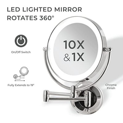 Zadro 11인치 LED 벽걸이 화장 거울 10X/1X 면도 거울 벽용 무선 또는 배터리 작동식 화장 거울(대형 | 10X/1X | 11인치 x 14.5인치, 크롬)     상품설명 - 양면 욕실 거울 - 양면 10배 또는 5배 1배 확대 글래머 미러 헤드가 수평 및 수직으로 360° 회전 및 피봇됩니다.