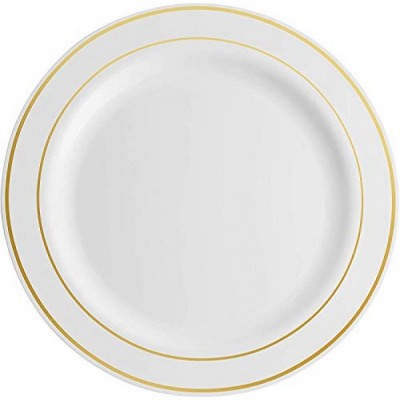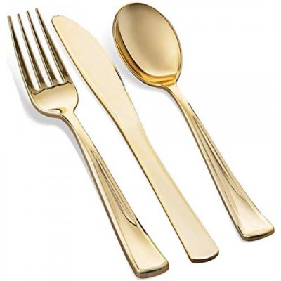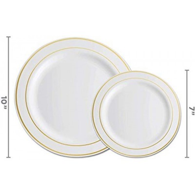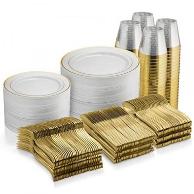 Munfix 600 Piece Gold Plastic Dinnerware Set, Disposable - 100 Gold Rim 10 inch and 7 Inch Plates, 300 Gold Silverware, 100 Gold Cups For 100 Guests