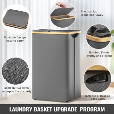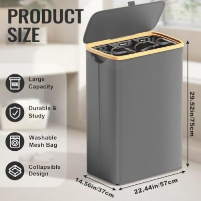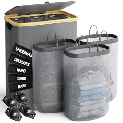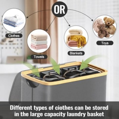 KIEUIENK 뚜껑이 있는 세탁 바구니, 160L 초대형 3섹션 세탁 바구니(옷 바구니용 바퀴 포함), 침실 세탁실용 접이식 바구니 정리함, 더러운 옷 바구니, 진한 회색