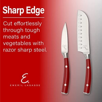 Emeril Lagasse Razor Sharp 2피스 셰프 나이프 세트 - 5인치 산토쿠 나이프, 3.5인치 스테인레스 스틸 패링 나이프, 단조 강철 피복 Emerilware - 빨간색 손잡이