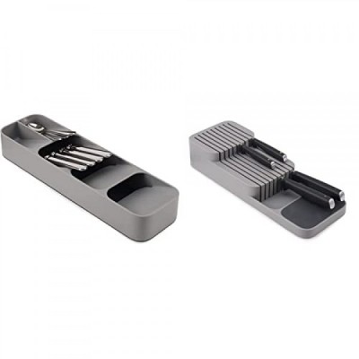 Joseph Joseph DrawerStore Compact Cutlery Organizer Kitchen Drawer Tray, Small,Gray & 85120 DrawerStore Kitchen Drawer Organizer Tray for Knives Knife Block, Gray