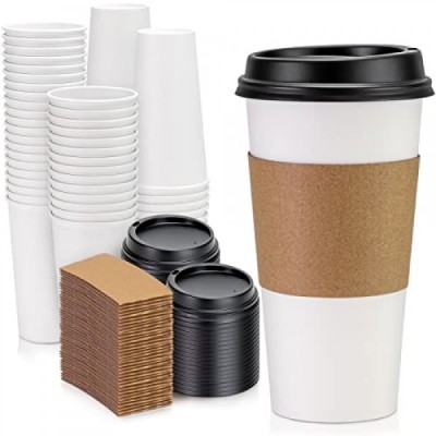 Fit Meal Prep 50 팩 뚜껑이 있는 20온스 일회용 커피 컵, 크래프트 슬리브 및 교반기, 뚜껑이 있는 프리미엄 대형 테이크아웃 커피 컵, 차가운/뜨거운 음료를 위한 내구성
