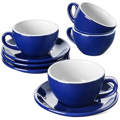 LE TAUCI 8 oz Cappuccino Cups with Saucers,Ceramic Large Coffee Cup for Au Lait, Double shot, Latte, Cafe Mocha, Tea - Set of 4, Blue