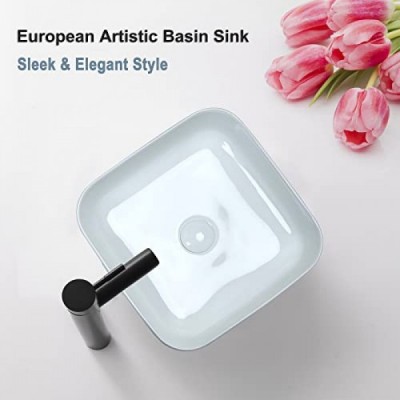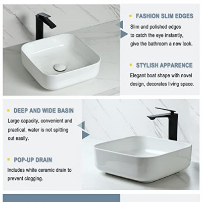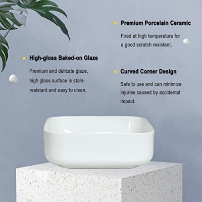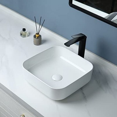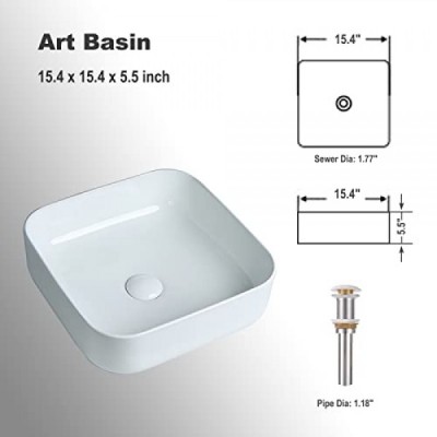 bathivy Vessel Sink with Pop up Drain, 15x15 White Bathroom Sink Rectangle Above Counter Ceramic Porcelain Washbasin Sink Bowl Bathroom Vanity Vessel Sink Basin Art Basin for Lavatory Vanity (White)
