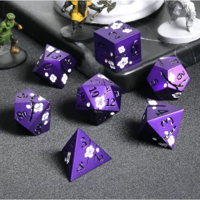 매트 퍼플 D&D 금속 주사위, DNDND 7 PCS 헤비 메탈릭 DND 주사위 세트, 던전 및 드래곤 테이블탑 게임용 엄청난 선물 케이스 포함(흰색 꽃이 있는 매트 퍼플)
