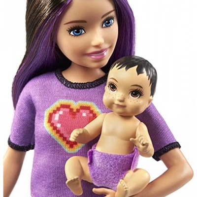 Barbie Skipper Babysitters Inc 인형 및 액세서리 세트, 체크 스커트의 Skipper 인형, Baby Doll & 4가지 테마 조각 Brunette Multicolor
