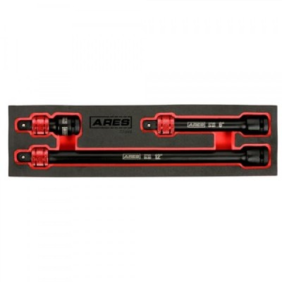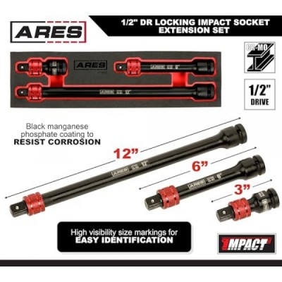 ARES 27098 – 3-Piece 1/2-Inch Drive Locking Impact Socket Extension Set – Aluminum Locking Ring Collar for Quick Release of Sockets and Accessories – 3-Inch, 6-Inch, and 12-Inch Extensions