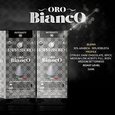 ESPRESSORO 20 USDA Organic Espresso Pods - BIANCO Aluminum Capsule Compatible with Nespresso Original Lines Machines. Intensity 10 Premium Italian Expresso Coffee Capsules