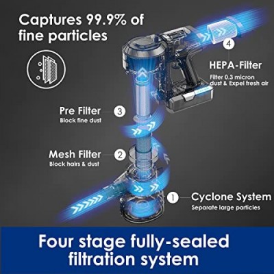 특징: 무선, 70분 작동시간, 경량, LED 헤드라이트, 4단계 HEPA 필터