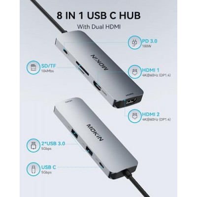 MOKiN USB C Docking Station Dual Monitor, USB C to Dual HDMI Adapter, 8 in 1 Laptop Docking Station with 2 HDMI(4K @60Hz), PD Charging, USB A&C 3.0 Ports, SD/TF for Dell/HP/Lenovo/Surface/Yoga etc