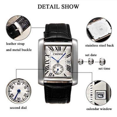 JewelryWe Men's Retro Calendar Analogue Quartz Watch with Rectangular Roman Numerals Dial and Leather Strap Colour: Black, Blue, Brown