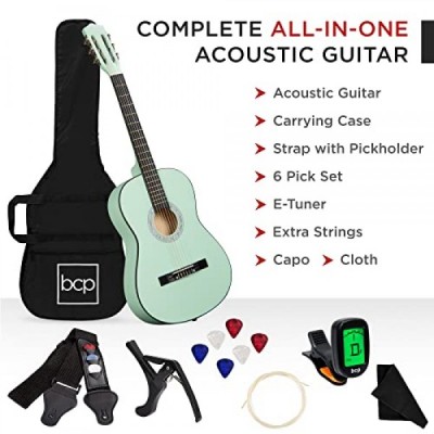 Best Choice Products 38in Beginner All Wood Acoustic Guitar Starter Kit w/Gig Bag, Digital Tuner, 6 Celluloid Picks, Nylon Strings, Capo, Cloth, Strap w/Pick Holder - SoCal Green