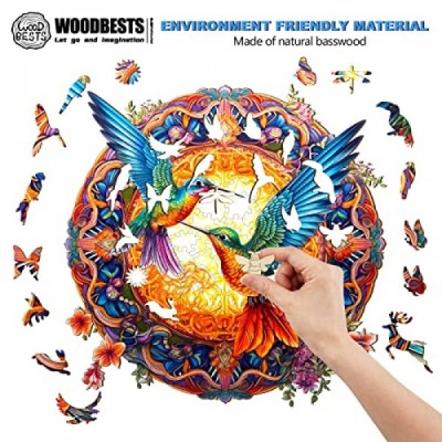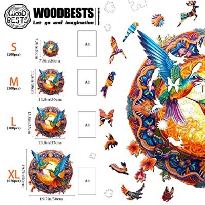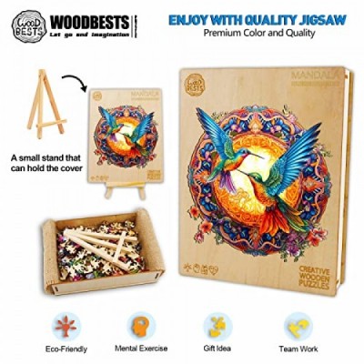 WOODBESTS 성인을 위한 나무 직소 퍼즐, 만다라 벌새 퍼즐(M, 200개, 11.8x11.8) 아름다운 나무 상자, 퍼즐 나무 독특한 모양, 성인과 어린이를 위한 생일 선물 가족 게임