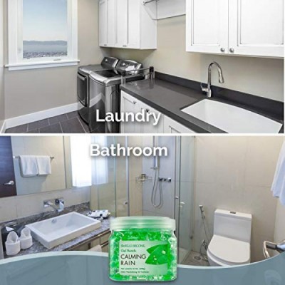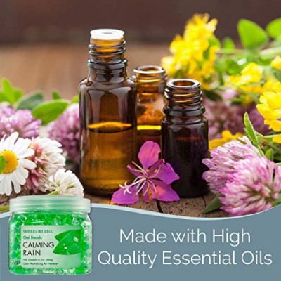 SMELLS BEGONE 냄새 제거제 젤 비드 - 공기 청정제 - 욕실, 자동차, 보트, RV 및 애완동물 구역의 냄새 제거 - 에센셜 오일로 제작 - 차분한 비 향 - 12온스