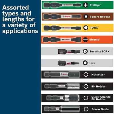 포함된 구성 요소: 삽입 비트: (1) Phillips® #1, (9) Phillips® #2, (1) Phillips® #3, (1) 정사각형 #1, (2) 정사각형 #2, (1) 정사각형 #3, ( 1) Torx® #15, (3) Torx® #20, (4) Torx® #25, (1) Torx® #30, (1) Torx® #40, (1) 슬롯형 6-8, (1) 슬롯 8-10; 2", 너트세터: (1) 1/4", (1) 5/16", (1) 3/8"; (1) 표준 비트 홀더; (1) 보관 케이스, 전원 비트: (4) Phillips® #2, (2) Square #2, (1) Torx® 15, (3) Torx® #20, (3) Torx® #25, (1) Torx® #30