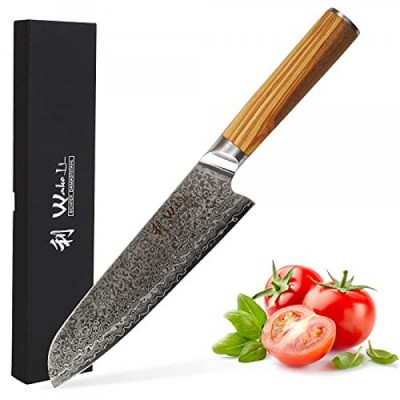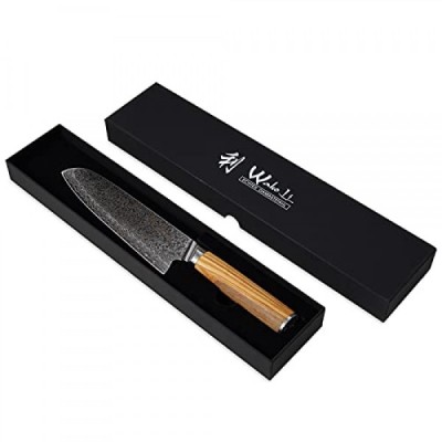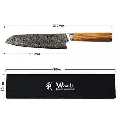 와콜리 다마스커스 산토쿠 칼날 7인치 67겹의 매우 날카로운 올리브 나무 손잡이가 있는 정품 일본 다마스커스, 오리부 시리즈
