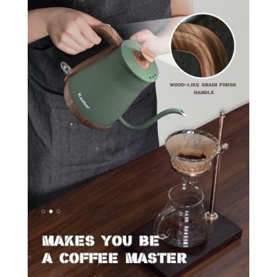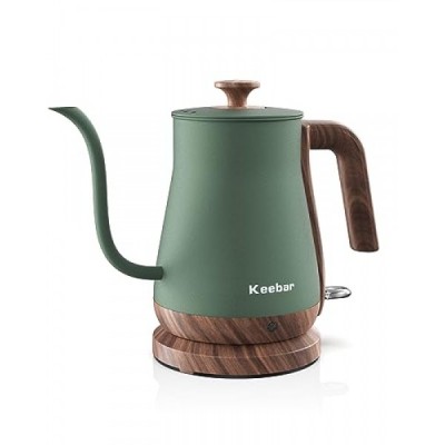 구즈넥 전기 주전자, 전기 차 주전자 스테인레스 스틸, 커피 주전자, 1000W 온수 주전자 전기 자동 차단, 0.8L, 나무결 마감 손잡이, 말차 녹색