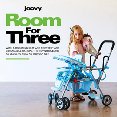 Joovy Toy Caboose Baby Doll Stroller Featuring Reclining Front Seat, Adjustable Footrest, Storage Basket, Extendable Canopy, and Snack Tray - Holds 3 Dolls (Blue Dot)