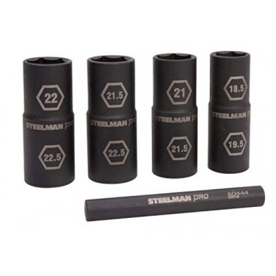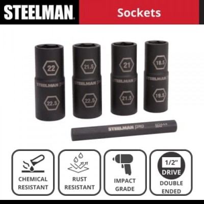 Steelman Pro 5-Piece 1/2-Inch Drive Metric 6-Point Thin Wall Impact Flip Socket and Knockout Bar Set with Half Sizes (18.5 x 19.5mm, 21 x 21.5mm, 22 x 22.5mm, and 21.5 x 22.5mm Sockets)