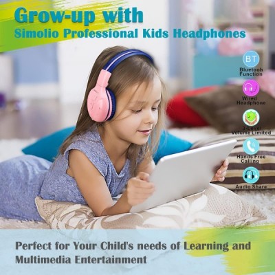 SIMOLIO Bluetooth Kinder Kopfhörer mit Legrenzter Lautstärke, Kindersicherer Kopfhörer mit Share Port, Drahtlose Kopfhörer für Kinder, Bluetooth Kinder Headsets für Mädchen -Pink 2-Pink