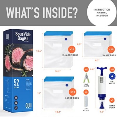 OUII Sous Vide Bags for Joule and Anova Cooker - 52 Pieces Kit with Vacuum Sealer Bags, Hand Pump, Clips - 3 Bag Sizes, Food Storage, Meal Prep - Fits Any Sous Vide Cooking Machine