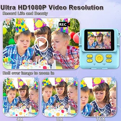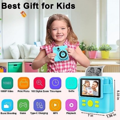 GKTZ Instant Print Camera for Kids - 1080P HD Instant Print Photo - Christmas Birthday Gifts for Age 4 5 6 7 8 9 10 Girls Boys - Portable Toy with 3 Rolls Photo Paper, 5 Color Pens, 32GB Card - Blue