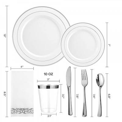 FOCUSLINE 175개 25인용 실버 식기 세트, 실버 림 플라스틱 접시 일회용 파티, 디너 접시 25개, 디저트 접시 25개, 컵 25개, 냅킨 25개, 포크 25개, 숟가락 25개, 칼 25개 포함