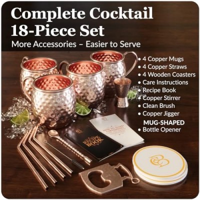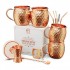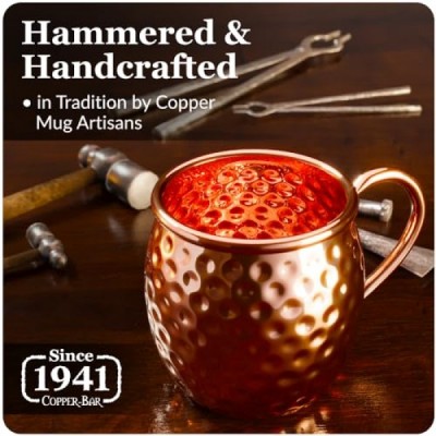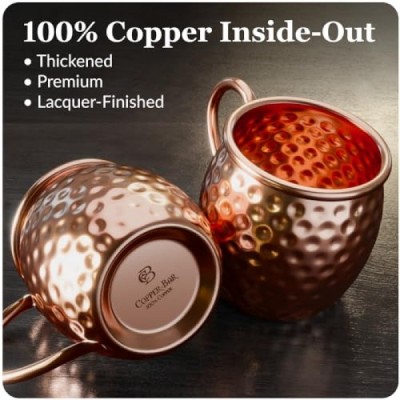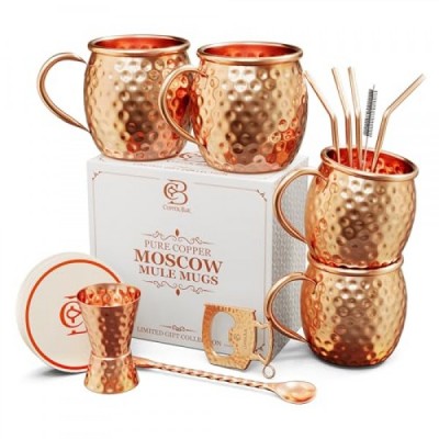 모스크바 뮬 구리 머그컵 | 망치로 만든 컵 4개 세트 | 100% 수공예 순수 고체 구리 | 칵테일 빨대와 선물 세트 | 유리잔 | 코스터 | Copper-Bar의 구리 교반기 및 맥주 오프너