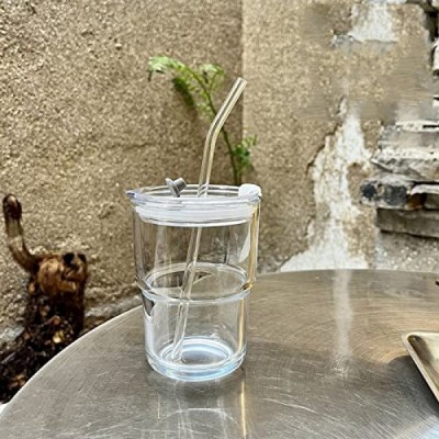 13OZ/400ML 아이스 커피 유리 텀블러, 밀짚 및 뚜껑 밀봉 휴대 가능, 두꺼운 벽 물 유리 컵 머그 티(투명)