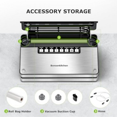 Bonsenkitchen Vacuum Sealer Machine, Stainless Steel Vacuum Food Sealer with 8-in-1 Vacuum Sealing System, 6 Food Vacuum Modes, Built-in Cutter and Bag Storage w/Starter Kit