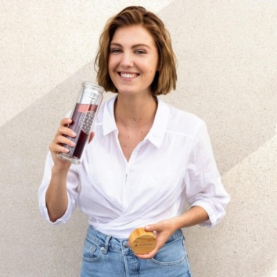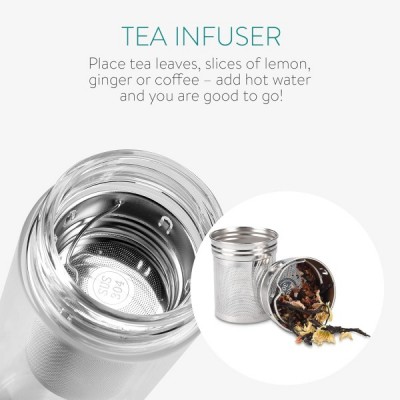 스트레이너가 있는 Navaris 유리 티 보틀 - 450ml 테이크아웃 티 보틀 찻주전자 - 여행용 음료수 병 - 생명의 꽃 커버가 있는 붕규산 유리 이중벽