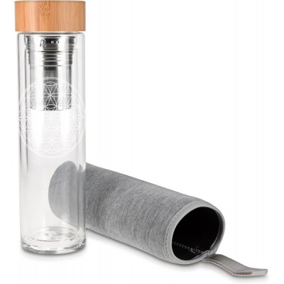 Navaris Teeflasche aus Glas mit Sieb - 450ml Tee Flasche Teekanne to go - Trinkflasche Travel - doppelwandig aus Borosilikatglas mit Hülle Blume des Lebens