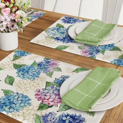 Seliem 봄 여름 꽃 꽃 Placemats 4 세트, 푸른 수국 잎 식탁 장소 매트, 계절 주방 장식 홈 인테리어 12x18 인치