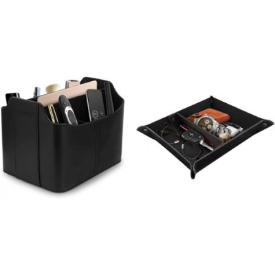 Londo 가죽 리모콘 오거나이저 및 홀더, 태블릿 컴파트먼트 포함, 리모콘 홀더 - 다기능 스토리지(블랙) & 빈 가죽 주머니 - Vide Poche - 가죽 트레이 오거나이저