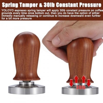 YOLOYO 53mm Espresso Tamper, 30lb Consistent Pressure Coffee Tamper, Calibrated Tamper for Espresso Machine 54mm Breville, Spring Loaded Tamper with Flat Stainless Steel Base (Precious Wood Handle)