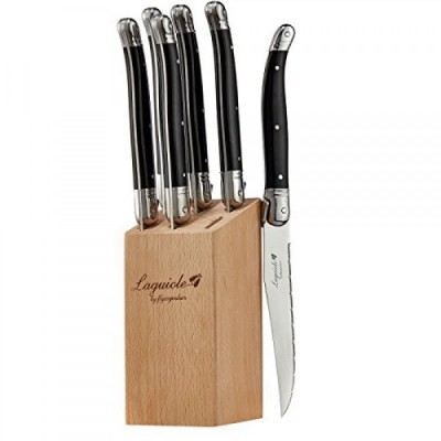 Laguiole By FlyingColors 스테이크 나이프 세트, 마이크로 톱니 모양의 블레이드, 스테인레스 스틸, 나무 블록, 블랙 컬러 핸들, 6개