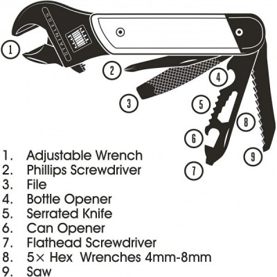 포함된 구성 요소: 렌치, 칼, 줄, 톱, 병따개, x5 육각 렌치, 2x 드라이버